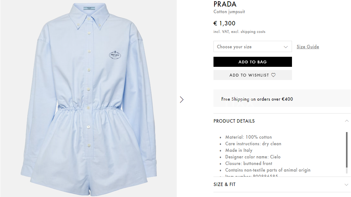 프라다 코튼 점프 슈트 【매장-200만원대】